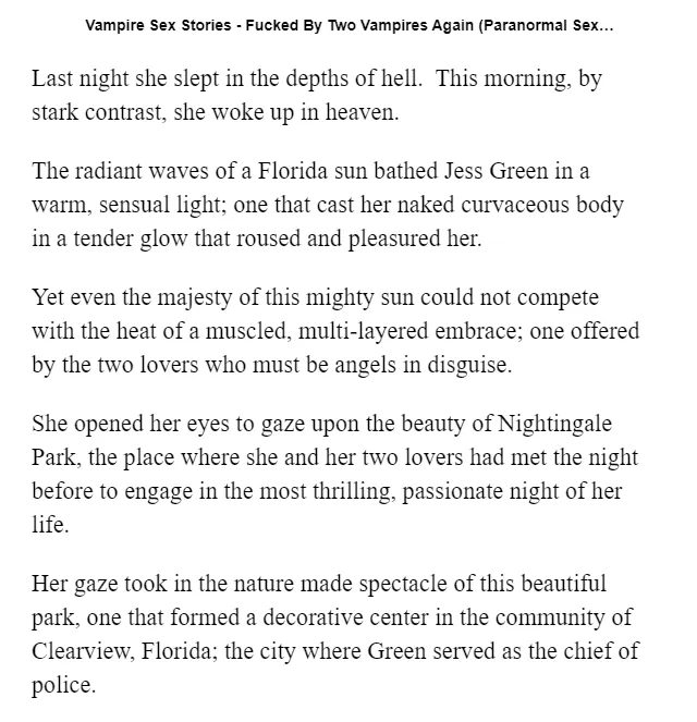 Un sous-genre de la littérature érotique – que je goûte fort peu, mais qui est très populaire depuis une quinzaine d’années – est la paranormal erotica qui met en scène des vampires, des loups-garous, ds sirènes, des fantômes et d’autres créatures fantastiques. La recette est toujours la même: une trame narrative de roman à l’eau de rose, parsemée de descriptions de copulations diverses, mettant en scène une personne humaine et une créature de légende dont la raison d’être est soudainement de répandre ses gènes plutôt que de terroriser les bonnes gens.