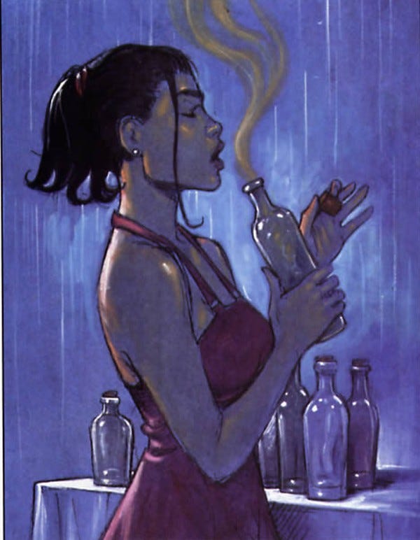 Curieusement, il n’y avait sur sa table ni les babioles en plastique ni les cartes postales antiques que je me serais attendue d’y retrouver. Y étaient plutôt entassées une centaine de bouteilles de verre de tailles et de formes diverses, en apparence vides et scellées par un bouchon de liège. L’une d’entre elles se distinguait par sa couleur, un turquin profond et mélancolique. Je la pris et fis mine de l’ouvrir en cherchant du regard l’approbation de la vendeuse. Je pris son impassibilité pour un acquiescement et tirai le bouchon.