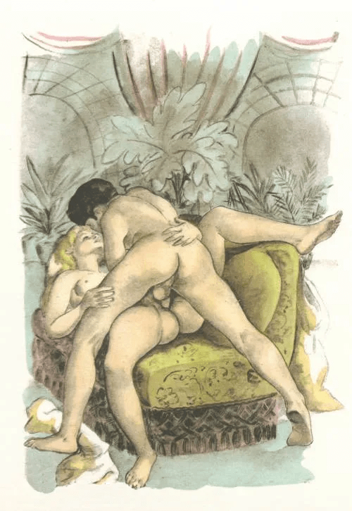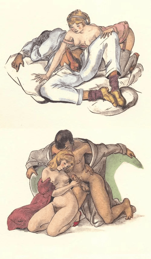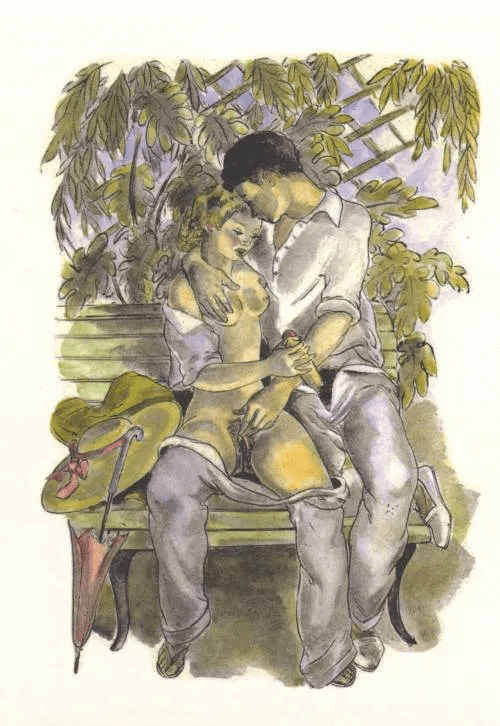 Pour le plaisir des yeux, voici quelques-une de ces aquarelles, qu’elle a réalisées en 1943 pour un ouvrage érotique anonyme intitulé Initiation amoureuse.
