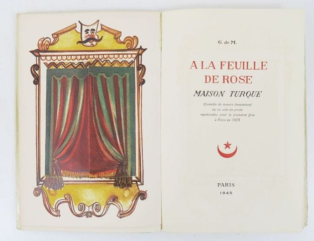 En 1875, Guy de Maupassant faisait jouer une pièce intitulée À la feuille de rose, maison turque. Le texte n’a été publié pour la première fois qu’en 1945.