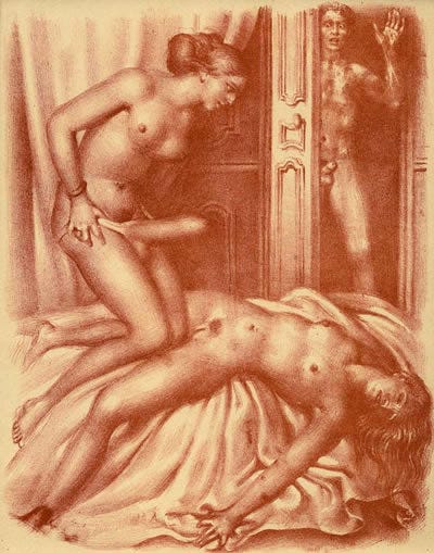 Au cours de la seconde nuit, quelque temps plus tard, Alcide, toujours dans la position du voyeur impuissant — que cette fois-ci il ne quittera pas — assiste aux ébats enragés des deux femmes. Il écoute aussi la suite du récit de Gamiani, qui plonge encore plus loin dans la débauche et la damnation, et assiste impuissant à l’empoisonnement de Fanny par Gamiani, elle-même plongée à l’agonie. C’est le point culminant du récit où se mêlent la petite mort et la mort tout court :