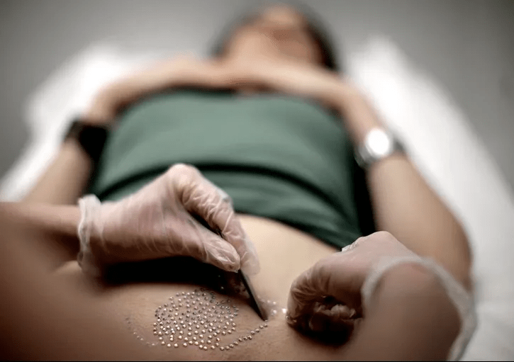 Dans un premier temps, le pubis est épilé (habituellement à la cire), puis du strass (ou des pierres précieuses si vous êtes milliardaire) sont collés sur la zone. Le résultat peut durer jusqu’à sept jours.