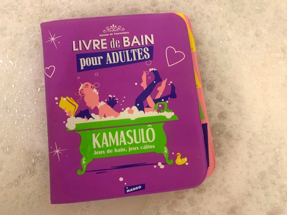 Ce senryū n’est qu’une demi-vérité. Ma collection de curiosa comprend effectivement un livre de bain en vinyle rembourré pour adultes intitulé Kamasulô, jeux de bain, jeux câlins.
