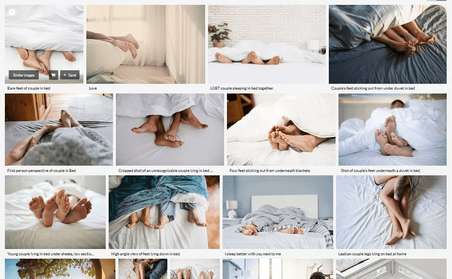 Quiconque fréquente les sites d’archives photos sait que l’allégorie de la relation sexuelle la plus fréquente est l’image de pieds dépassant d’un édredon – comme l’illustre cette capture du site Getty Images que je viens tout juste de faire.