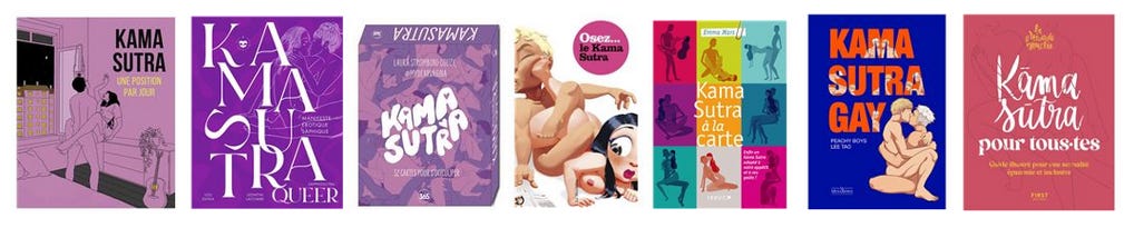 Le Kamasutra a eu à partir du xxe siècles des milliers d’imitateurs et de réinterprétations, sous forme de guide illustré, de bande-dessinée, de cartes, de posters, de calendriers – et des versions queer, gay, lesbiennes. Mon préféré est Le Kamasutra au bureau, qui avec un pince-sans-rire se moque de l’aliénation que nous subissons au travail. Je vous en parlerai dans la six-cent-cinquante-sixième goutte !