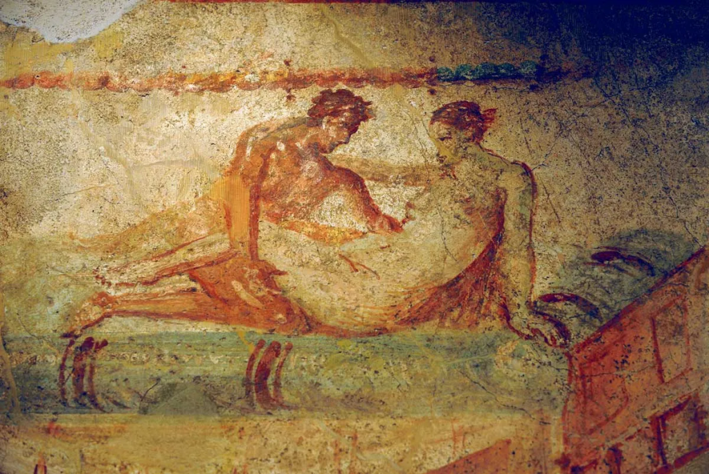 Dans ce senryū, je parle du lupanar de Pompéi, mais il y en avait évidemment plusieurs. Je pensais surtout au plus célèbre d’entre eux: le lupanar du Viccolo Storto, le seul construit uniquement à cet effet. Situé à l’angle de deux petites rues tortueuses et mal famées de la partie la plus ancienne de la ville, l’établissement disposait de cinq lits au rez-de-chaussée et autant au premier étage. L’activité était soutenue, à en juger par la présence de plus de cent-vingt graffiti – et de fresques érotiques devenues très célèbres.