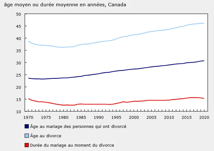 Selon Statistiques Canada, la diminution du taux de divortialité est liée au vieillissement de la population mariée – les jeunes générations préférant l’union libre. Une autre conséquence du vieillissement des couples mariés est la croissance de l’âge moyen au divorce. Les gens se marient de plus en plus vieux et divorcent une quinzaine d’années plus tard.