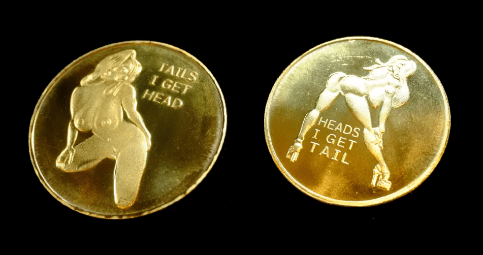Ne vous posez pas plus longtemps la question : évidemment que ça existe, une pièce pour tirer à pile ou face à quelle activité sexuelle on va s’adonner. La dernière fois que j’ai vérifié, on pouvait s’en procurer de multiples genres pour un prix modique allant de cinq à dix dollars américains.