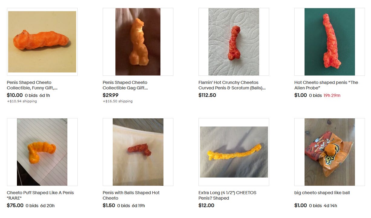 Cela dit, si vous trouvez un Cheetos qui a vaguement la forme d’un pénis, allez le mettre en vente sue ebay, il y a semble-t-il un marché pour ce genre de chose.