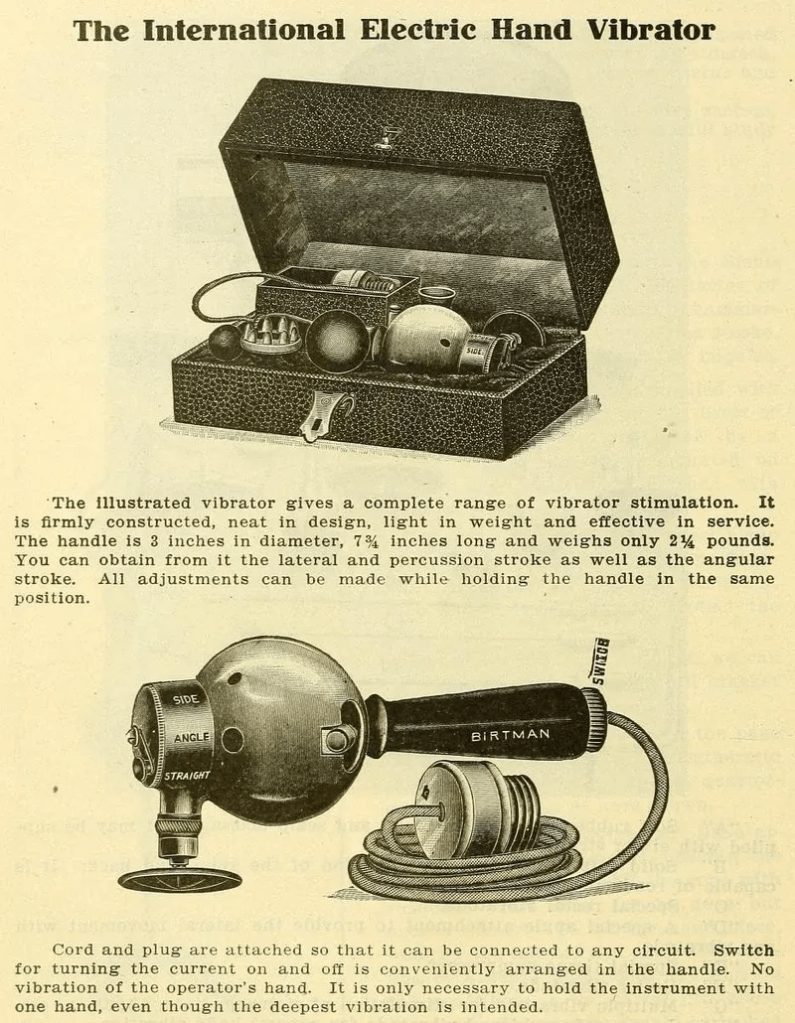 Rachel Maines raconte dans son livre que les médecins détestaient traiter l’hystérie, car ils se plaignaient de crampes dans les mains et leurs doigts étaient fatigués. Les médecins ne semblent pas plus désireux de s’atteler à la tâche de produire l’orgasme chez les femmes que ne l’étaient les partenaires sexuels qui les envoyaient en thérapie. Tout moyen d’accélérer le paroxysme hystérique était recherché avec empressement. Le premier vibromasseur mécanisé utilisait une manivelle. Et avant que les villes ne commencent à mesurer la consommation d’eau, il y eut une brève vogue pour les vibrateurs domestiques alimentés par une roue à eau miniature reliée à un évier.