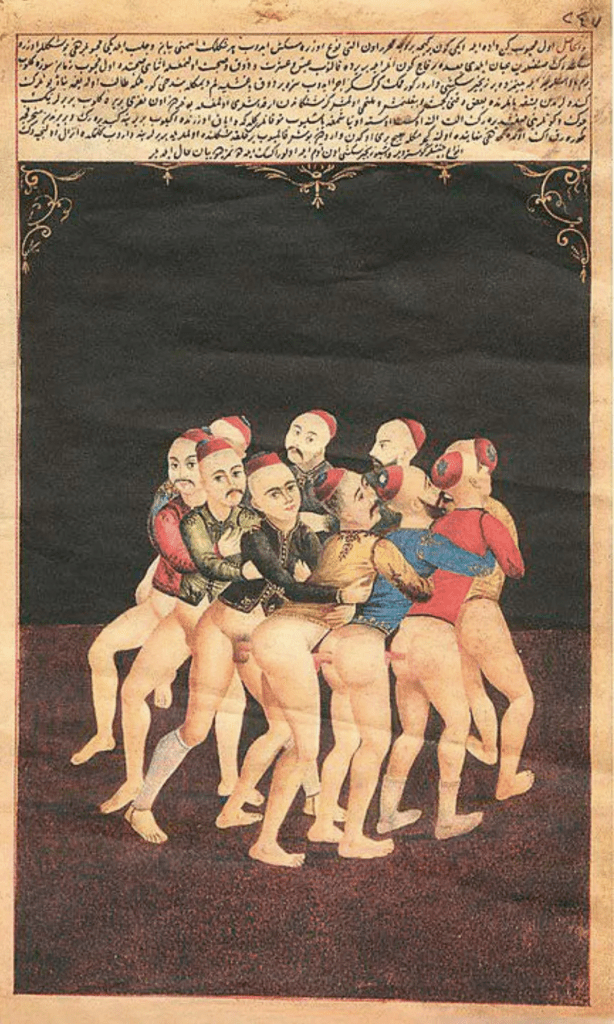 Le petit train est la position sexuelle où plusieurs hommes se sodomisent en formant une chaîne. Lorsque les participants forment un cercle, on qualifie la chose de cercle grec – quoi que, à mon humble avis, on pourrait très bien appeler ça le cercle turc, si je me fie à ce manuscrit ottoman de 1773.
