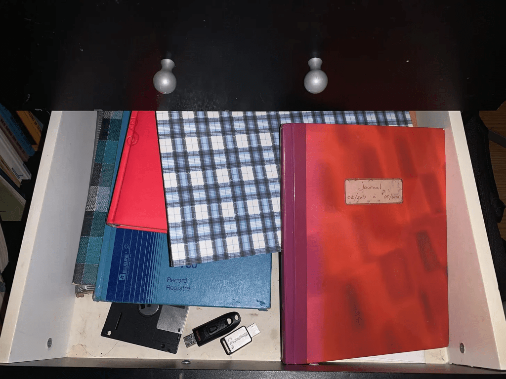Bien sûr, il y a mon tiroir – ou plutôt, mes tiroirs, parce que j’ai trois commodes remplies de cahiers, de clés usb et même de disquettes (que je n’arriverai probablement plus jamais à lire). Mais c’est sans compter les boîtes qui remplissent trois garde-robes sur quatre dans mon demi-sous-sol. Des pages et des pages de journaux intimes, de projets inaboutis et de carnets griffonnés à l’encre violette. Des milliers de pages d’obscénités extirpées pendant des décennies de mon cerveau malade.