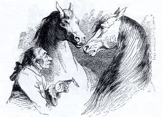 Mon livre ne contenait que deux voyages de Gulliver: celui à Lilliput (avec ses tout petits habitants) et celui à Brobdingnag (où il devient pour ainsi dire l’animal de compagnie d’un peuple de géants). C’était assez pour que la critique de Swift de l’État, des souverains et de la futilité de la guerre me parvienne. Ce n’est hélas que beaucoup plus tard que j’ai pu lire le dernier voyage de Guilliver, qui est aussi la meilleure partie du livre: celui au pays des Houyhnhnms.